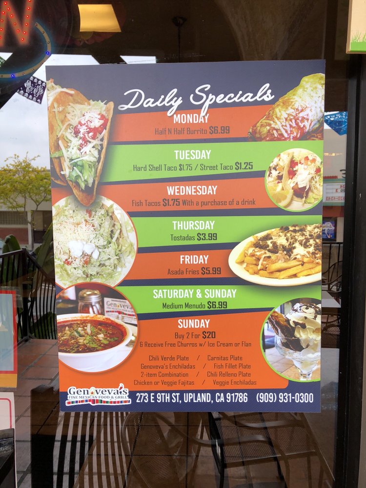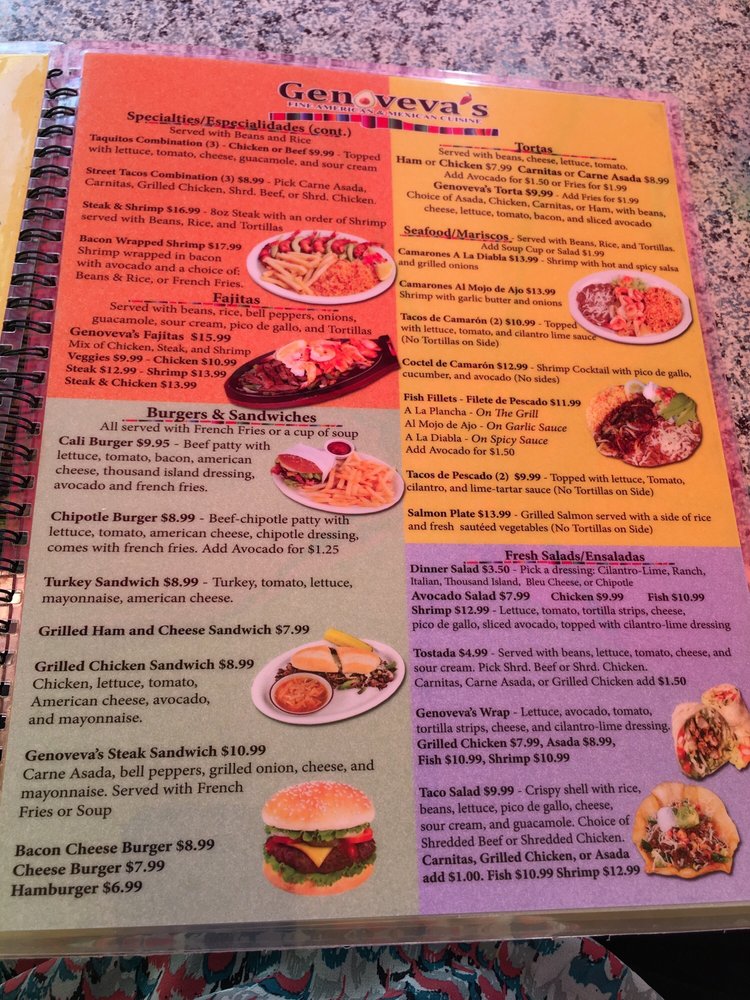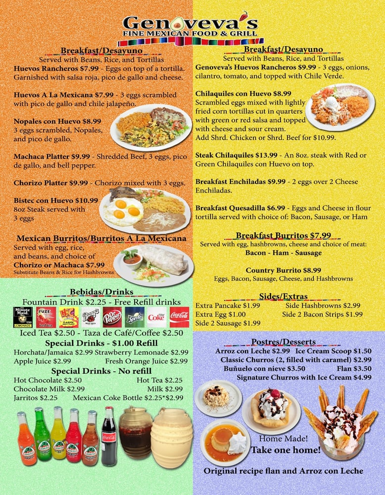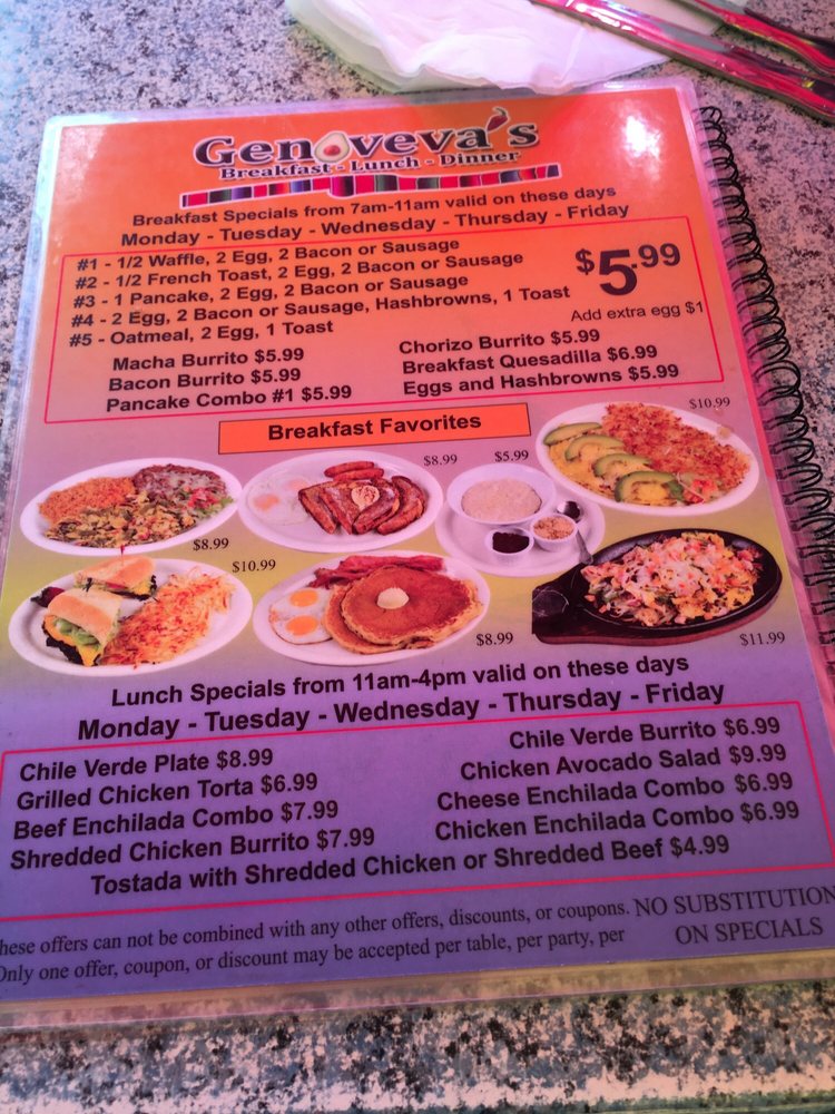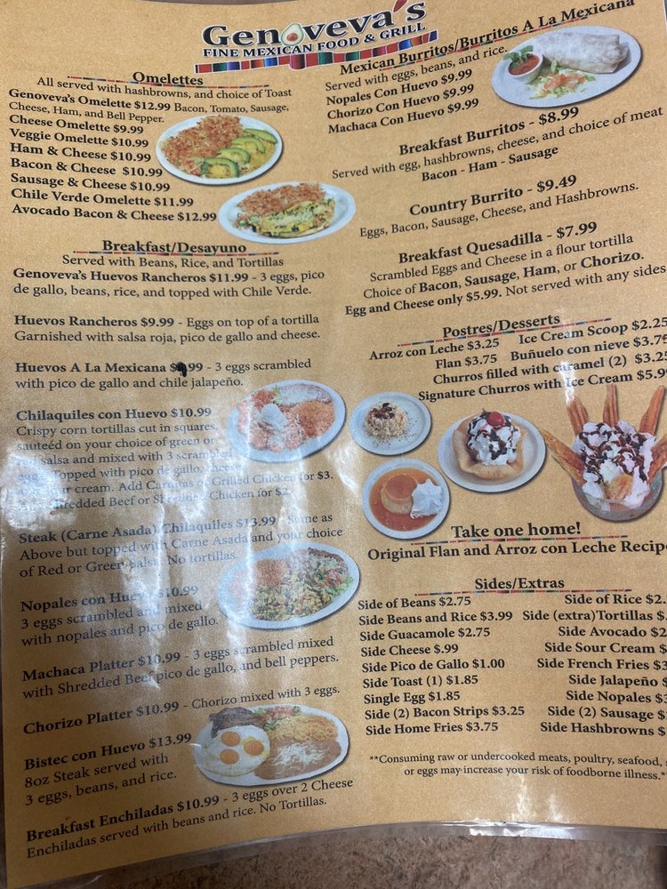 Genoveva's is a versatile dining spot in Upland, CA, offering a wide array of Mexican and American breakfast options, with a casual yet classy atmosphere. The restaurant caters to various dining preferences, including vegetarian and gluten-free options. Guests can enjoy a range of beverages from iced tea to Mexican Coke, alongside hearty breakfast dishes like Steak and Eggs and Huevos Rancheros. The restaurant also offers outdoor seating, catering services, and happy hour specials. Customers have praised the attentive service and tasty food, with highlights being the Chicken Wet Burrito and Chicken Enchiladas. The homemade flavors and Covid19 safety measures make dining at Genoveva's a pleasant experience. Overall, Genoveva's provides a satisfying dining experience with a mix of traditional and contemporary flavors.